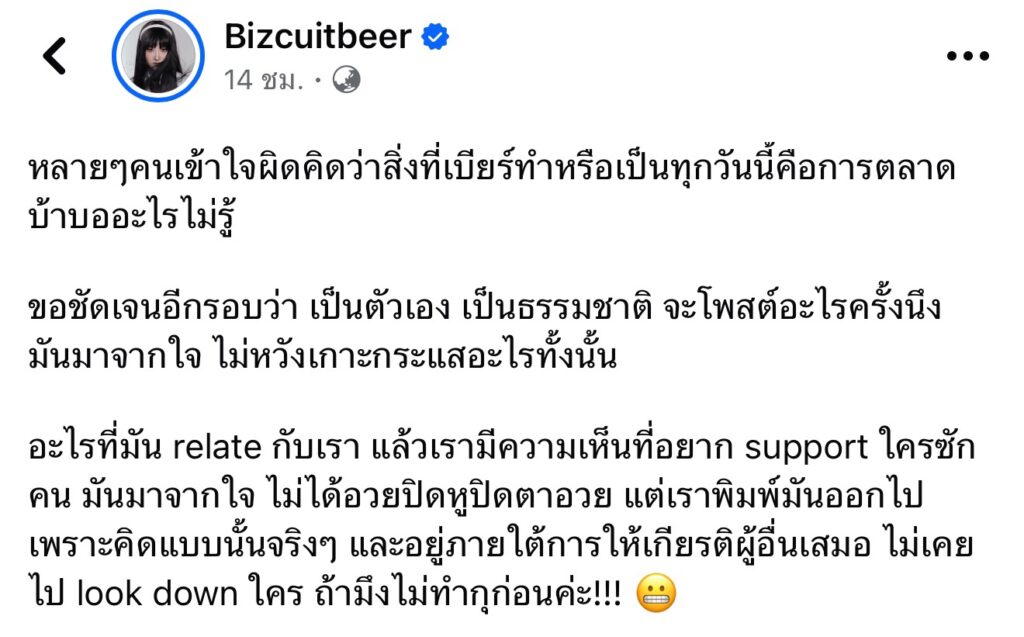 ต่อมาสาว ”เบียร์“ ก็ทนไม่ไหว ออกมาโพสต์ข้อความอีกว่า ”หลายๆคนเข้าใจผิดคิดว่าสิ่งที่เบียร์ทำหรือเป็นทุกวันนี้คือการตลาดบ้าบออะไรไม่รู้ ขอชัดเจนอีกรอบว่า เป็นตัวเอง เป็นธรรมชาติ จะโพสต์อะไรครั้งนึง มันมาจากใจ ไม่หวังเกาะกระแสอะไรทั้งนั้น