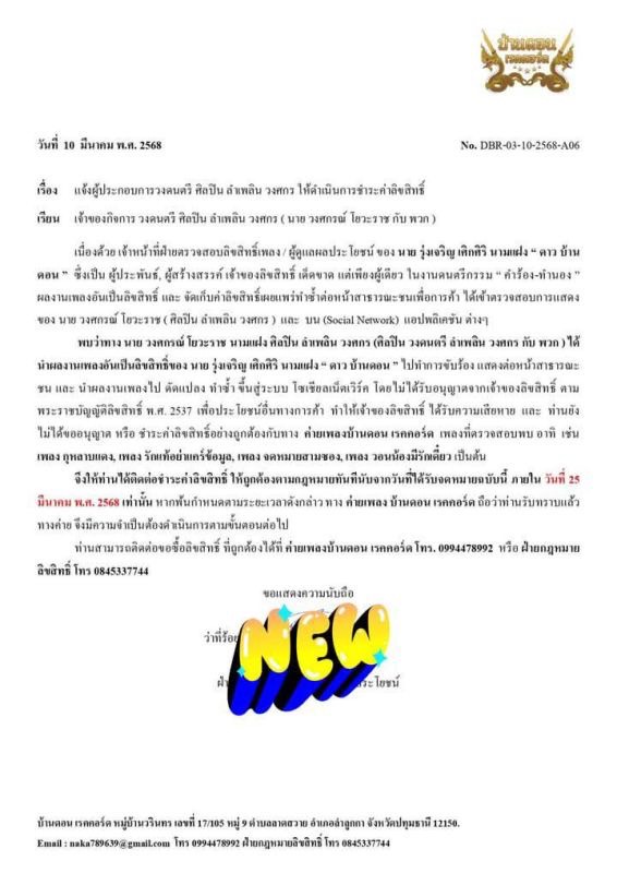 จึงให้ท่านได้ติดต่อชำระค่าลิขสิทธิ์ ให้ถูกต้องตามกฎหมายทันทีนับจากวันที่ได้รับจดหมายฉบับนี้ ภายใน วันที่ 25 มีนาคม พ.ศ. 2568 เท่านั้น หากพ้นกำหนดตามระยะเวลาดังกล่าว ทาง ค่ายเพลง บ้านคอน เรคคอร์ด ถือว่าท่านรับทราบแล้วทางค่าย จึงมีความจำเป็นต้องดำเนินการตามขั้นตอนต่อไปท่านสามารถติดต่อขอซื้อลิขสิทธิ์ ที่ถูกต้องได้ที่ ค่ายเพลงบ้านตอน เรกกอร์ค โทร. 0994475992 หรือ ฝ่ายกฎหมายลิขสิทธิ์ โทร. 0845337744