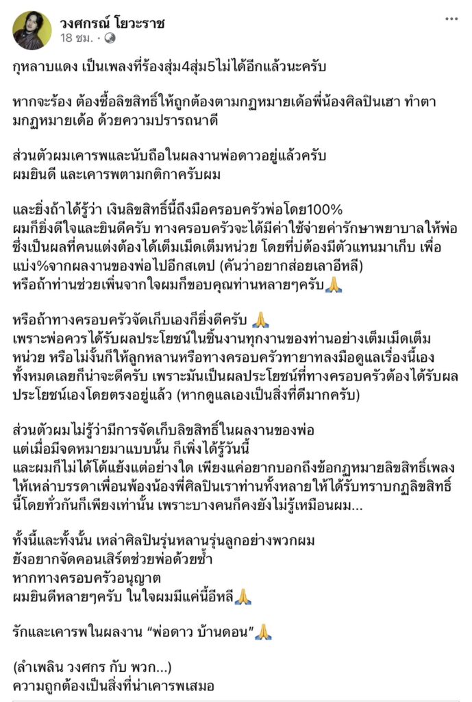 “เรื่อง แจ้งผู้ประกอบการวงดนตรี ศิลปิน ลำเพลิน วงศกร ให้ดำเนินการชำระค่าลิขสิทธิ์