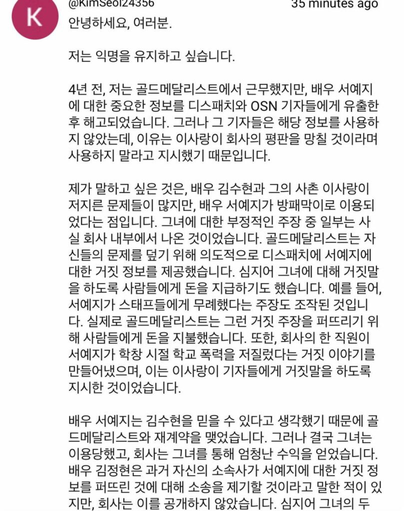 “สวัสดีทุกคน ฉันไม่ขอบอกว่าฉันเป็นใครนะ เมื่อ 4 ปีก่อน ฉันเคยทำงานที่ Gold Medalist แต่ถูกไล่ออกหลังจากเปิดเผยข้อมูลสำคัญเกี่ยวกับนักแสดงสาว ‘ซอเยจี’ ให้กับ Dispatch และนักข่าว OSN อย่างไรก็ตาม นักข่าวเหล่านั้นไม่ได้นำข้อมูลไปใช้ เพราะมีบุคคลหนึ่งในบริษัทสั่งให้พวกเขาไม่ใช้ข้อมูลดังกล่าว โดยให้เหตุผลว่ามันจะทำให้ชื่อเสียงของบริษัทเสียหาย