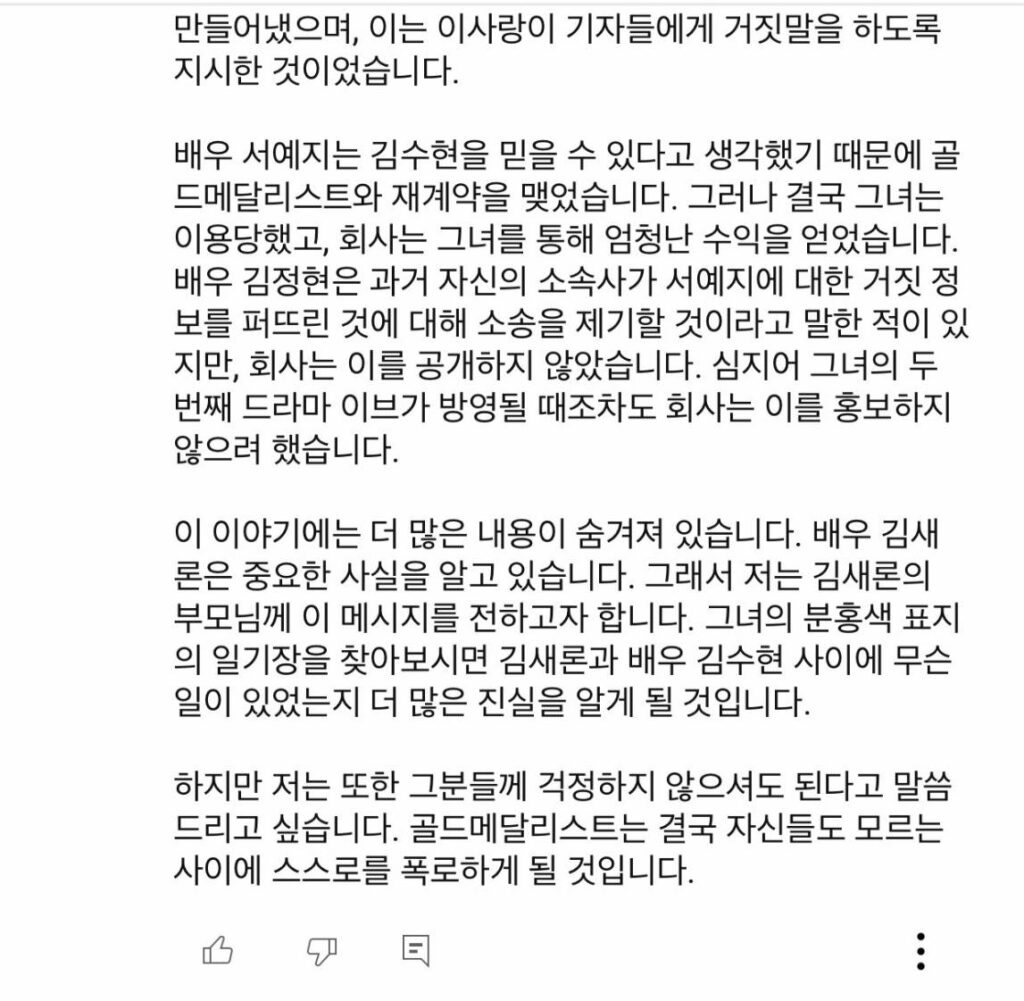 สิ่งที่ฉันอยากจะบอกคือ ถึงแม้จะมีปัญหามากมายเกี่ยวกับนักแสดง ‘คิมซูฮยอน’ และบุคคลที่เป็นญาติของเขาซึ่งเป็นผู้บริหารของบริษัท แต่ ‘ซอเยจี’ ก็ถูกใช้เป็นเกราะกำบัง บริษัทจงใจให้ข้อมูลเท็จเกี่ยวกับเธอ และถึงขั้นจ่ายเงินให้บางคนเพื่อให้โกหกเกี่ยวกับเธอ ตัวอย่างเช่น ข้อกล่าวหาว่าเธอปฏิบัติต่อทีมงานอย่างไม่ดีนั้นเป็นเรื่องแต่งขึ้น นอกจากนี้ บริษัทได้สร้างเรื่องโกหกเกี่ยวกับซอเยจีว่าเธอเคยเป็นผู้กระทำความรุนแรงในโรงเรียน ซึ่งเป็นคำสั่งโดยตรงจากผู้บริหารของบริษัทที่ให้เผยแพร่เรื่องโกหกเหล่านี้