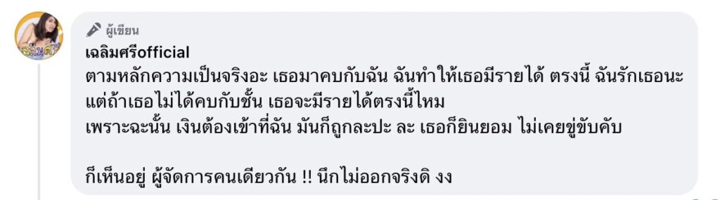 “ตามหลักความเป็นจริงอะ เธอมาคบกับฉัน ฉันทำให้เธอมีรายได้ ตรงนี้ ฉันรักเธอนะ แต่ถ้าเธอไม่ได้คบกับชั้น เธอจะมีรายได้ตรงนี้ไหม เพราะฉะนั้น เงินต้องเข้าที่ฉัน มันก็ถูกละปะ ละ เธอก็ยินยอม ไม่เคยขู่ขับคับ