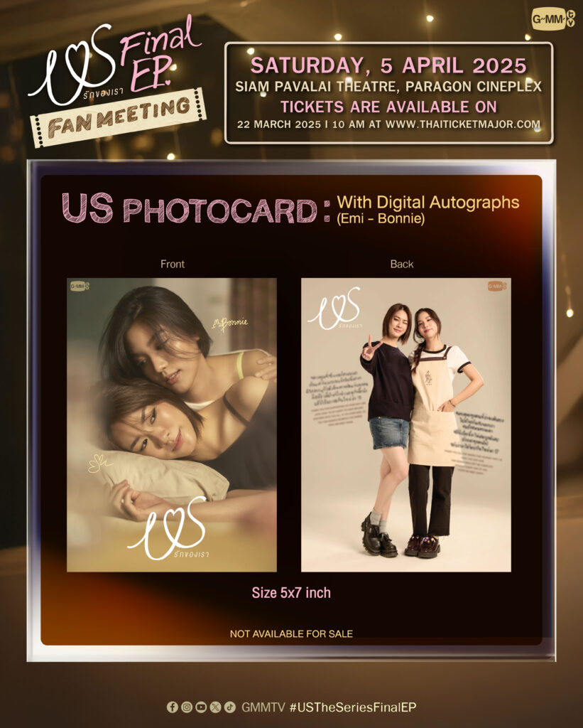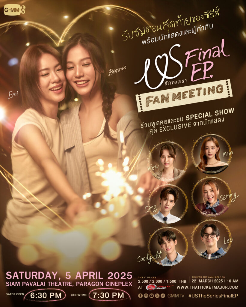 ทำเอาแฟนๆ ทั้งอินและฟินชุดใหญ่ไปกับทุกโมเมนต์ชวนเคลิ้มในเรื่องราวความรักของพี่สาวคนสวย “แพม” รับบทโดย “เอมี่-ทสร กลิ่นเนียม” กับม๋าเด็กสุดน่ารัก “ดอกรัก” รับบทโดย “บอนนี่-ภัทราภัสร์ โบรัชตะสุวรรณ์” ที่ทั้งคู่เสิร์ฟเคมีใหม่ถ่ายทอดความสัมพันธ์ที่ต้องเลือกระหว่างความรักและความถูกต้อง ได้อย่างลงตัวสุดๆ ตั้งแต่ EP. แรกที่ออกอากาศจนถึงตอนล่าสุด ในซีรีส์แนวโรแมนติก-ดราม่า รสชาติใหม่ เรื่อง “Us รักของเรา”เมื่อความรัก…เกิดกับคนที่ไม่ควรรัก จาก“GMMTV” คอนเทนต์โพรไวเดอร์ชั้นนำของเมืองไทย และก่อนที่ซีรีส์จะลาจอไป “เอมี่-บอนนี่” จึงแท็คทีมแก๊งเพื่อนสุดปัง “วิว-เบญญาภา จีนประสม, มิ้ม-รัตนวดี วงศ์ทอง, ซิง-หฤษฎ์ ชีวการุณ, สุดยอด-พัฐสิฏ เพิ่มพูนสวัสดิ์, แซมมี่-ซาแมนท่า เมลานี่ โค้ทส์, เลโอ โซสเซย์” ชวนแฟนๆ ร่วมรับชมตอนสุดท้ายของซีรีส์ ลุ้นบทสรุปความสัมพันธ์ของทุกตัวแสดง พร้อมนักแสดงและผู้กำกับฯ คุณภาพ“ฝน-ขนิษฐา ขวัญอยู่” ในงาน “US Final EP. FAN MEETING” วันเสาร์ที่ 5 เมษายน 2568 เวลา 19.30 น. ณ ชั้น 6 สยามพารากอน – โรงภาพยนตร์สยามภาวลัย Paragon Cineplex พร้อมร่วมพูดคุยและชม SPECIAL SHOW สุดEXCLUSIVE จากเหล่านักแสดง งานนี้รับรองว่าแฟนๆ ได้รับความสุขแบบเต็มอิ่มกลับบ้านไปแน่นอน
