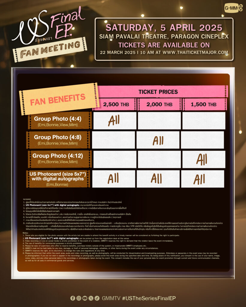 สำหรับผู้ที่สนใจสามารถจับจองบัตรเข้าร่วมงาน “US Final EP. FAN MEETING” โดยจะเปิดจำหน่ายบัตร ในวันเสาร์ที่ 22 มีนาคมนี้ เวลา10.00 น. เป็นต้นไป บัตรราคา 2,500 / 2,000 / 1,500 บาท ที่ ไทยทิคเก็ตเมเจอร์ทุกสาขา, www.thaiticketmajor.com และ Call Center โทร 0-2262-3456 พร้อมสิทธิ์รับ US Photocard (size 5×7″) with with digital autographs ทุกที่นั่ง สามารถรับได้ที่จุดลงทะเบียนหน้างาน และติดตามรายละเอียดเพิ่มเติมได้ที่ เว็บไซต์ : www.thaiticketmajor.com, Facebook / Instagram / X / TikTok / YouTube / Weibo: GMMTV