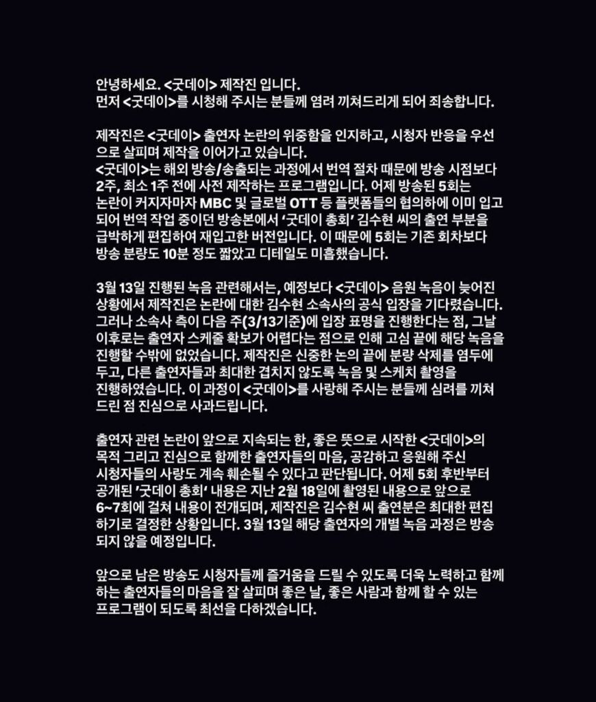 “สวัสดี นี่คือทีมงานรายการ Good Day ก่อนอื่นเราต้องขออภัยอย่างจริงใจที่ทำให้ผู้ชมเกิดความกังวล ทีมงานตระหนักถึงความร้ายแรงของข้อโต้แย้งที่เกิดขึ้นเกี่ยวกับนักแสดงของ Good Day และกำลังดำเนินการผลิตโดยคำนึงถึงปฏิกิริยาของผู้ชมเป็นสำคัญ Good Day เป็นรายการที่ต้องทำการผลิตล่วงหน้าอย่างน้อย 1 สัปดาห์หรือมากถึง 2 สัปดาห์เนื่องจากต้องมีกระบวนการแปลคำบรรยายสำหรับการออกอากาศระหว่างประเทศ ตอนที่ออกอากาศเมื่อวาน (ตอนที่ 5) ถูกตัดต่ออย่างเร่งรีบทันทีที่เราได้รับทราบถึงความประเด็นที่เกิดขึ้น และส่วนที่มี “คิมซูฮยอน” ก็ถูกตัดต่อและอัปโหลดใหม่โดยด่วน เวอร์ชันนี้ตัดต่อร่วมกับ MBC และแพลตฟอร์มสตรีมมิ่งระดับโลก ซึ่งอยู่ระหว่างการแปลคำบรรยายอยู่แล้ว ส่งผลให้ตอนที่ 5 สั้นกว่าปกติประมาณ 10 นาที และรายละเอียดก็น้อยกว่าที่คาดไว้