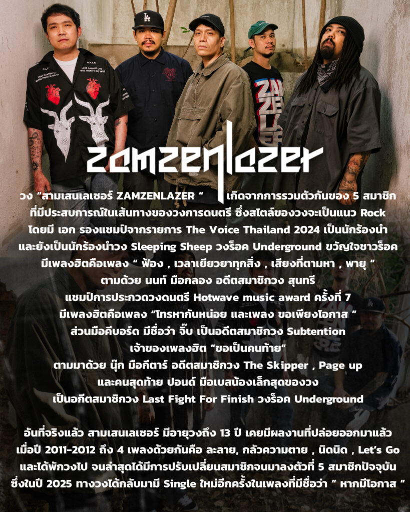 “โดยหวังว่า single นี้จะทำให้ทุกท่านได้สัมผัสถึงความตั้งใจของทั้งผมและเพื่อนๆ วงสามเสนเลเซอร์ ว่าแม้พวกเราจะได้โอกาสที่ยอดเยี่ยมจากเวทีแข่งขัน แต่เราก็พร้อมที่จะก้าวต่อไป และแม้ผลที่ออกมาจะเป็นดั่งที่เราวาดหวังไว้หรือไม่ ก็ยังดีกว่ามองย้อนกลับมาแล้วรู้สึกว่าเราไม่ทำมันให้ดีพอในวันที่มีโอกาส ใน Single “หากมีโอกาส” วง “สามเสนเลเซอร์ ZAMZENLAZER “ เกิดจากการรวมตัวกันของ 5 สมาชิก ที่มีประสบการณ์ในเส้นทางของวงการดนตรีมาอย่างยาวนาน ซึ่งสไตล์ของวงจะเป็นแนว Rock โดยมี “เอก” รองแชมป์จากรายการ The Voice Thailand 2024 เป็นนักร้องนำ และยังเป็นนักร้องนำวง Sleeping Sheep วงร็อค Underground ขวัญใจชาวร็อค มีเพลงฮิตคือเพลง “ ฟ้อง , เวลาเยียวยาทุกสิ่ง , เสียงที่ตามหา , พายุ ”ตามด้วย นนท์ มือกลอง อดีตสมาชิกวง สุนทรี แชมป์การประกวดวงดนตรี Hotwave music award ครั้งที่ 7 มีเพลงฮิตคือเพลง “โทรหากันหน่อย และเพลง ขอเพียงโอกาส ” ส่วนมือคีบอร์ด มีชื่อว่า “จิ๊บ” เป็นอดีตสมาชิกวง Subtention( ซับเทนชั่น ) เจ้าของเพลงฮิต “ขอเป็นคนท้าย” ตามมาด้วย “นุ๊ก” มือกีตาร์ อดีตสมาชิกวง The Skipper , Page up และคนสุดท้าย ปอนด์ มือเบสน้องเล็กสุดของวงเป็นอดีตสมาชิกวง Last Fight For Finish วงร็อค Underground”