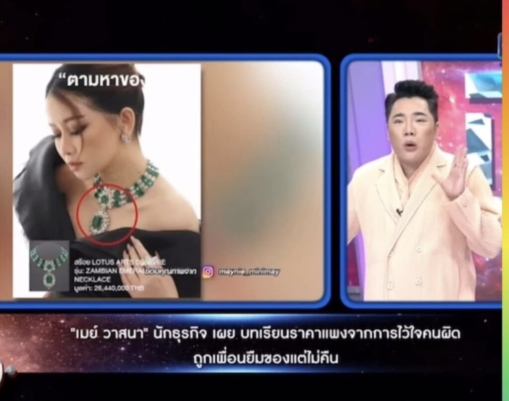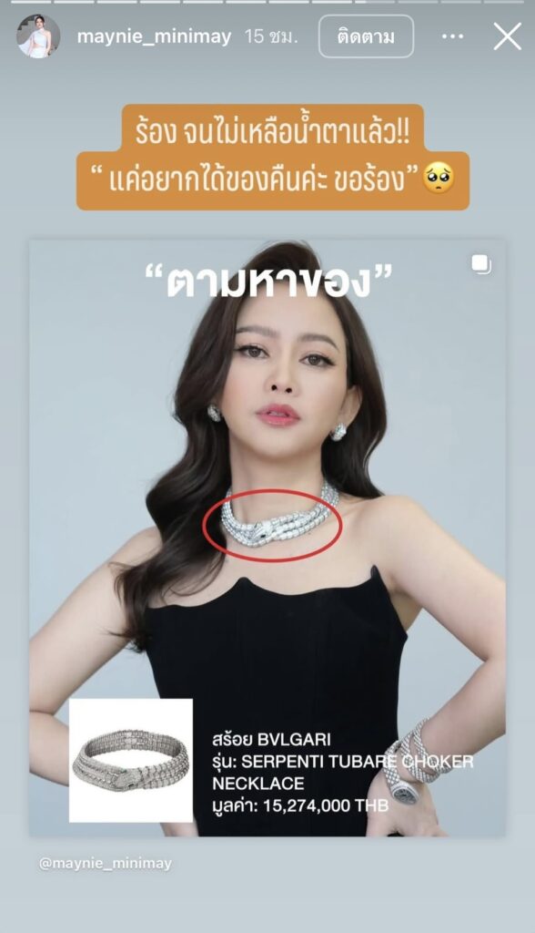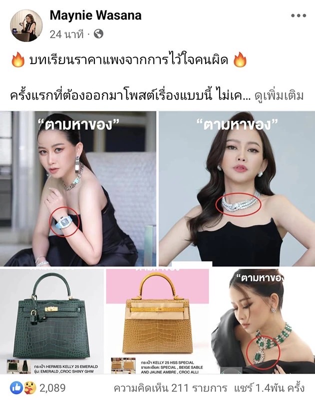 “ของกระจัดกระจายไปตั้งแต่ปีที่แล้ว ร้านที่เขารับซื้อมาก็ไม่รู้ แอร์เมส 3 ล้าน มาขายล้านเดียว สมมติ 60 ล้าน อย่าง BULGARI เส้นเดียวเรารู้ก็ 15 ล้าน Richard Mille 13 ล้านแล้ว เกิน 20 ล้านยังไม่รวมแอร์เมส อะไร ถ้ามีคนบอกถือไว้หน่อย 20 ล้าน อุ้มไว้หน่อย ได้กำไร 40 ล้าน อยู่แล้ว ให้โอกาสถึงสิ้นเดือน ก็ยังไม่ได้ เลยเข้าแจ้งความแล้ว แล้วออกมาโพสต์เพราะถึงกำหนดแล้ว จริงๆเขาให้ยืมแค่ 15 วัน”