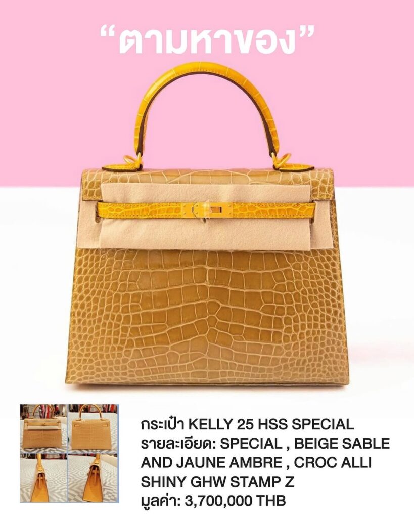 4. กระเป๋า Kelly 25 HSS Special รุ่น: Special , Beige sable and jaune Ambre , Croc Alli shiny GHW Stamp Z มูลค่า: 3,700,000 THB
