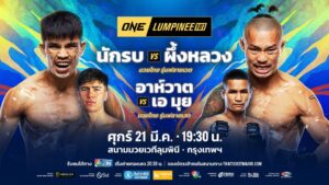 สำหรับสัปดาห์นี้ ศุกร์ที่ 21 มี.ค. ศึก ONE ลุมพินี 101 พร้อมเสิร์ฟความเดือดไม่ขาดตอน โดยคู่เอก “นักรบ แฟร์เท็กซ์” นักชกอาวุธหนักจากสุรินทร์ ปะทะ “ผึ้งหลวง บ้านแรมบ้า” กำปั้นใจเด็ดจากอุบลราชธานี ในกติกามวยไทย รุ่นฟลายเวต (125-135 ป.) ขณะที่คู่เอกภาคอินเตอร์ “อาห์วาต กอร์ดอน” ดาวรุ่งไฟแรง วัย 17 ปี จากอิสราเอล ประเดิมไฟต์แรกเจอสายแข็ง “เอ มุย” จอมบู๊วัย 22 ปี จากเมียนมา ในกติกามวยไทย รุ่นฟลายเวต