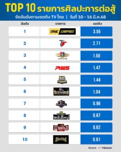 ศึก ONE ลุมพินี ฉลองครบนรอบลอีเวนต์นัดที่ 100 อย่างยิ่งใหญ่ โดยจากข้อมูลการจัดอันดับเรตติงในกลุ่มรายการศิลปะการต่อสู้ทางทีวีไทย ระหว่างวันที่ 10-16 มี.ค.68 โดยสถาบัน Nielsen ปรากฏว่าศึกนี้ได้รับการตอบรับจากผู้ชมทางช่อง 7HD กด 35 ถึงราว 2 ล้านครัวเรือน ไม่รวมผู้ชมทางออนไลน์และช่องพันธมิตร คิดเป็นตัวเลขเรตติง 3.55