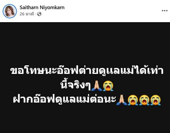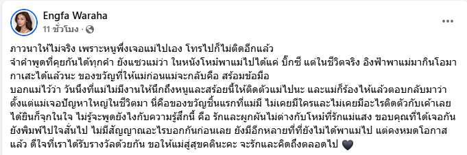 ได้ยินก็จุกในใจ ไม่รู้จะพูดยังไงกับความรู้สึกนี้ คือ รักและผูกผันไม่ต่างกับโหม๋ที่รักแม่แสง ขอบคุณที่ได้เจอกัน ยังพิมพ์ไปใจสั่นไป ไม่มีสัญญาณอะไรบอกกันก่อนเลย ยังมีอีกหลายที่ที่ยังไม่ได้พาแม่ไป แต่คงหมดโอกาสแล้ว ดีใจที่เราได้รับรางวัลด้วยกัน ขอให้แม่สู่สุขคตินะคะ จะรักและคิดถึงตลอดไป ”
