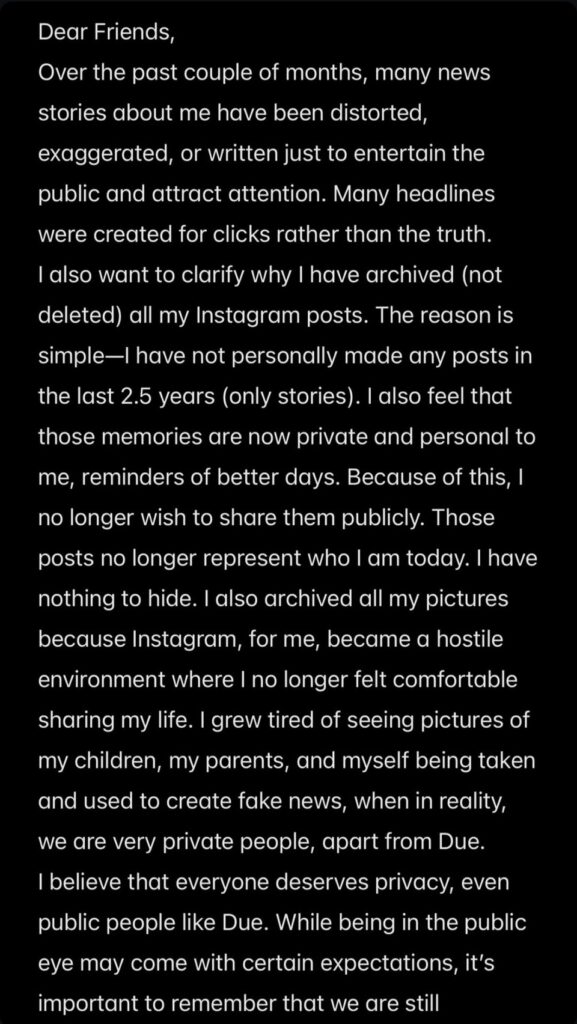 I believe that everyone deserves privacy, even public people like Due. While being in the public eye may come with certain expectations, it’s