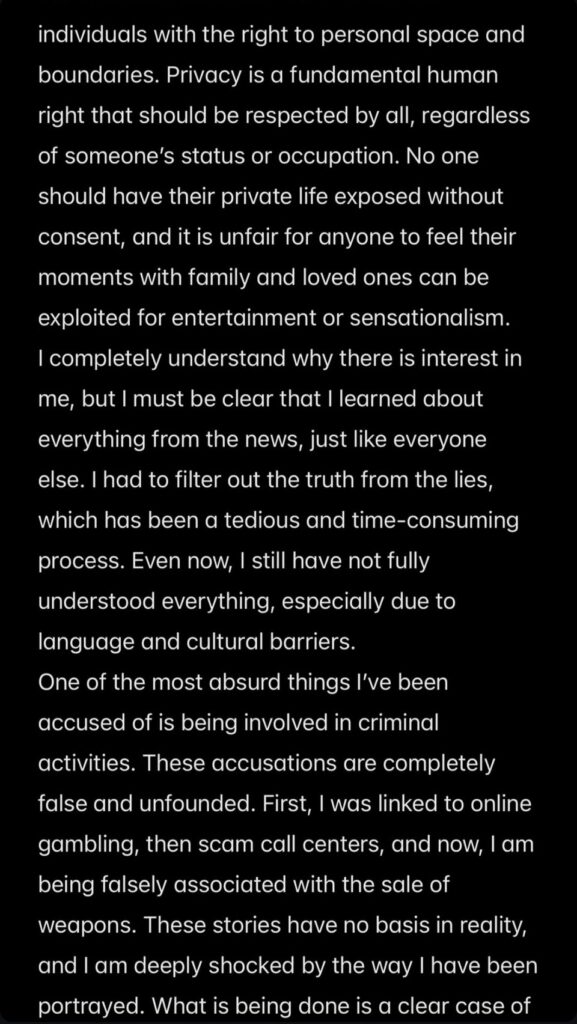 เจ้าตัวยังเผยอีกว่าอีกว่า “หนึ่งในข้อกล่าวหาที่ไร้สาระที่สุดที่ผมถูกโยงเข้าไปคือการมีส่วนเกี่ยวข้องกับอาชญากรรม ข้อกล่าวหาเหล่านี้เป็นเรื่องโกหกและไม่มีมูลความจริงเลย เริ่มจากการที่ผมถูกเชื่อมโยงกับการพนันออนไลน์ จากนั้นก็เป็นศูนย์คอลเซ็นเตอร์หลอกลวง และตอนนี้ ผมกลับถูกกล่าวหาว่ามีส่วนเกี่ยวข้องกับการค้ามือปืน เรื่องเหล่านี้ไม่มีพื้นฐานจากความจริงเลย และผมรู้สึกตกใจอย่างมากหลังจากตกเป็นข่าว