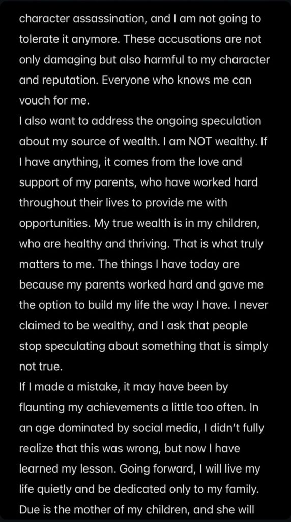 มันถือว่าเป็นการทำลายชื่อเสียง และผมจะไม่ขอทนอีกต่อไป ข้อกล่าวหาเหล่านี้ไม่เพียงแต่สร้างความเสียหาย แต่ยังเป็นอันตรายต่อชื่อเสียงและตัวตนของผม ทุกคนที่รู้จักผมสามารถยืนยันความบริสุทธิ์ของผมได้ ผมอยากพูดถึงการคาดเดาต่าง ๆ เกี่ยวกับแหล่งที่มาและความมั่งคั่งของผมด้วย ผมไม่ได้ร่ำรวย สิ่งที่ผมมีเกิดจากความรักและการสนับสนุนจากพ่อแม่ของผม ซึ่งพวกเขาทำงานหนักมาตลอดชีวิตเพื่อให้ผมมีโอกาสที่ดี ความมั่งคั่งที่แท้จริงของผมคือลูก ๆ ของผมที่มีสุขภาพแข็งแรงและเติบโตอย่างดี นั่นคือสิ่งที่สำคัญที่สุดสำหรับผม ทุกสิ่งที่ผมมีในวันนี้เป็นเพราะพ่อแม่ของผมทำงานหนักและให้โอกาสผมในการสร้างชีวิตในแบบที่ผมต้องการ ผมไม่เคยอ้างว่าตัวเองร่ำรวย และผมขอให้ทุกคนหยุดการคาดเดาเกี่ยวกับเรื่องที่ไม่เป็นความจริงนี้