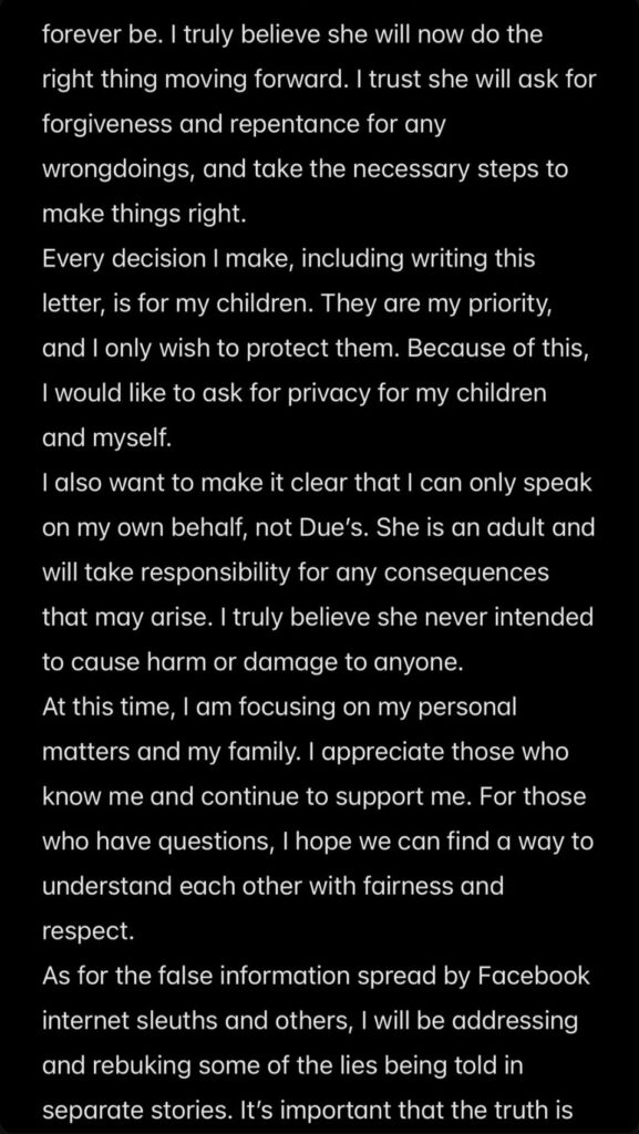 I also want to address the ongoing speculation about my source of wealth. I am NOT wealthy. If I have anything, it comes from the love and support of my parents, who have worked hard throughout their lives to provide me with opportunities. My true wealth is in my children, who are healthy and thriving. That is what truly matters to me. The things I have today are because my parents worked hard and gave me the option to build my life the way I have.