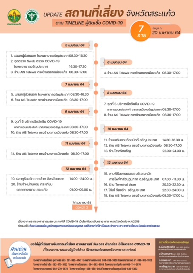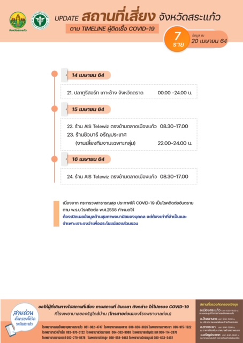 นพ.ประภาส ผูกดวง นายแพทย์สาธารณสุขจังหวัดสระแก้ว เปิดเผยถึงรายละเอียดของผู้ติดเชื้อรายใหม่ 7 รายของวันนี้ ว่า 2 รายแรกเป็นผู้สัมผัสเชื้อร่วมบ้านกับผู้ป่วยยืนยัน ได้แก่ เด็กชายอายุ 10 ปีสัมผัสเชื้อจากบิดาที่ป่วยก่อนหน้านี้ซึ่งเชื่อมโยงจากร้านคนหัวมุม อำเภอเมืองสระแก้ว อีกรายเป็นหญิงอายุ 37 ปี เป็นกลุ่มเสี่ยงสูงที่สัมผัสเชื้อกับบุคคลในบ้านจากสามีที่ไปเที่ยวร้านโรงพัก อรัญประเทศ