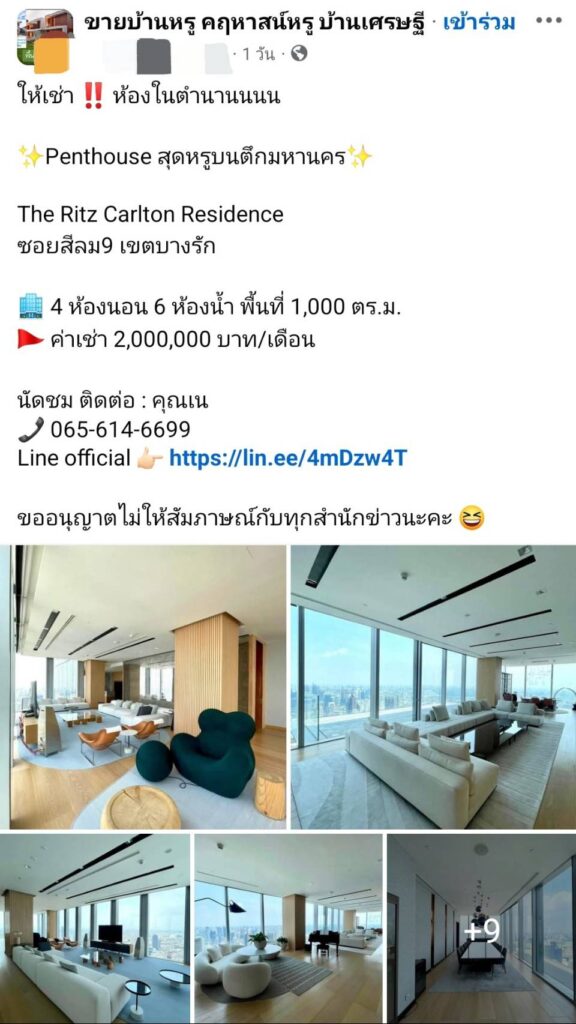 ล่าสุดในกลุ่มเฟสบุ๊คได้มีการประกาศให้เช่าเพนท์เฮาส์ดังกล่าวโดยระบุข้อความว่า “ให้เช่า ห้องในตำนานนนน Penthouse สุดหรูบนตึกมหานคร The Ritz Carlton Residence ซอยสีลม9 เขตบางรัก 4 ห้องนอน 6 ห้องน้ำ พื้นที่ 1,000 ตร.ม. ค่าเช่า 2,000,000 บาท/เดือน นัดชม ติดต่อ : คุณเน 065-614-6699 Line official https://lin.ee/4mDzw4T ขออนุญาตไม่ให้สัมภาษณ์กับทุกสำนักข่าวนะคะ”