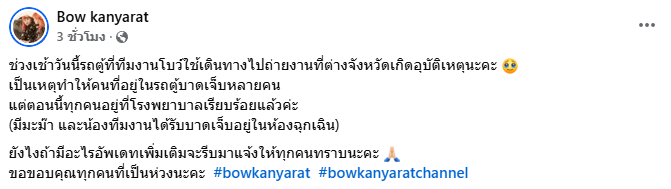 “ช่วงเช้าวันนี้รถตู้ที่ทีมงานโบว์ใช้เดินทางไปถ่ายงานที่ต่างจังหวัดเกิดอุบัติเหตุนะคะ 🥹 เป็นเหตุทำให้คนที่อยู่ในรถตู้บาดเจ็บหลายคน แต่ตอนนี้ทุกคนอยู่ที่โรงพยาบาลเรียบร้อยแล้วค่ะ (มีมะม๊า และน้องทีมงานได้รับบาดเจ็บอยู่ในห้องฉุกเฉิน) ยังไงถ้ามีอะไรอัพเดทเพิ่มเติมจะรีบมาแจ้งให้ทุกคนทราบนะคะ 🙏🏻 ขอขอบคุณทุกคนที่เป็นห่วงนะคะ #bowkanyarat #bowkanyaratchannel”