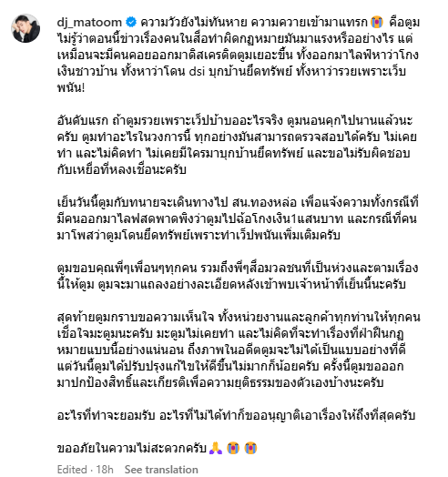 ล่าสุด “ดีเจมะตูม” ก็ได้โพสต์รูปภาพและข้อความอัพเดทการเข้าแจ้งความที่ สน.ท่องหล่อ โดยระบุว่า