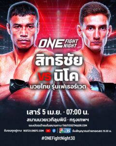 เปิดโปรแกรมร้อนต้อนรับเดือนมหาสงกรานต์กับ ศึก ONE Fight Night 30 ที่เสิร์ฟคู่มวยคุณภาพอัดแน่นตลอดทั้งรายการ ชูโรงศึกชิงเข็มขัดแชมป์โลกถึง 2 คู่ ร่วมด้วยการแสดงฝีมือของ 3 ตัวแทนนักกีฬาไทย “สิทธิชัย ศิษย์สองพี่น้อง”, “เสกสรร อ.ขวัญเมือง” และ “ทองพูน พีเค.แสนชัย” พร้อมส่งสัญญาณสดสู่ผู้ชมใน 195 ประเทศทั่วโลก จากสนามมวยเวทีลุมพินี (รามอินทรา) ในช่วงไพรม์ไทม์อเมริกา ซึ่งตรงกับช่วงเช้าเวลา 07:00 น. ในวันเสาร์ที่ 5 เม.ย.นี้