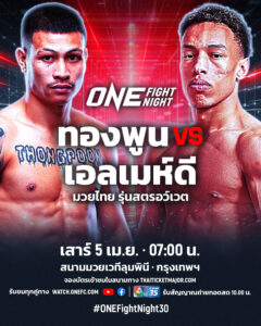 เปิดโปรแกรมร้อนต้อนรับเดือนมหาสงกรานต์กับ ศึก ONE Fight Night 30 ที่เสิร์ฟคู่มวยคุณภาพอัดแน่นตลอดทั้งรายการ ชูโรงศึกชิงเข็มขัดแชมป์โลกถึง 2 คู่ ร่วมด้วยการแสดงฝีมือของ 3 ตัวแทนนักกีฬาไทย “สิทธิชัย ศิษย์สองพี่น้อง”, “เสกสรร อ.ขวัญเมือง” และ “ทองพูน พีเค.แสนชัย” พร้อมส่งสัญญาณสดสู่ผู้ชมใน 195 ประเทศทั่วโลก จากสนามมวยเวทีลุมพินี (รามอินทรา) ในช่วงไพรม์ไทม์อเมริกา ซึ่งตรงกับช่วงเช้าเวลา 07:00 น. ในวันเสาร์ที่ 5 เม.ย.นี้