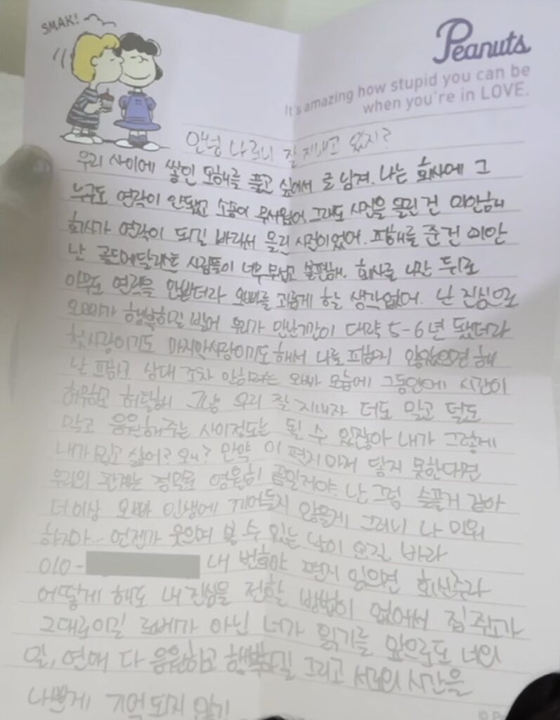 “ฉันสัญญาไม่ก้าวก่ายชีวิตอีก อย่าเกลียดฉันเลย” ก่อนจะเขียนเบอร์โทรศัพท์ของเธอลงไปและขอให้ “คิมซูฮยอน” ติดต่อกลับ