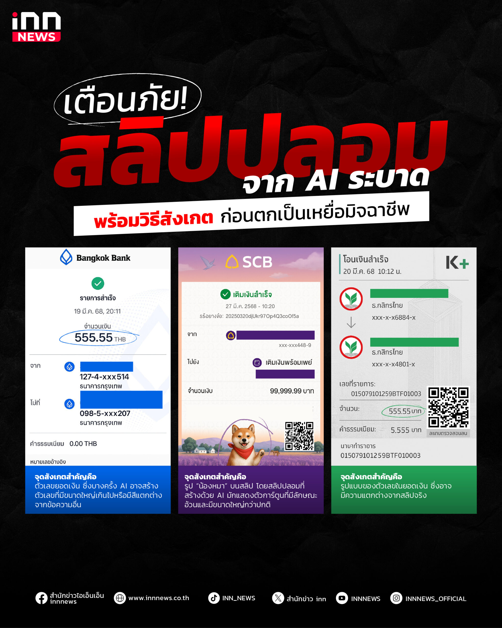 เตือนภัย! สลิปปลอมจาก AI ระบาด พร้อมวิธีสังเกตก่อนตกเป็นเหยื่อมิจฉาชีพ