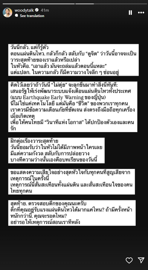 “วันนี้ยอมรับว่าในหัวไม่ได้มีภาพหน้าใครเลย มีแต่ความกังวล สลับกับการปล่อยวาง บางทีความว่างนั้นเองคือบทเรียนของวันนี้ ขอแสดงความเสียใจอย่างสุดหัวใจกับทุกคนที่สูญเสียจาก เหตุการณ์ในครั้งนี้ เหตุการณ์นี้สั่นสะเทือนทั้งแผ่นดิน และสั่นสะเทือนใจของคน ไทยทุกคน สุดท้ายตรวจสอบตึกของคุณนะครับตึกที่คุณอยู่รับแรงแผ่นดินไหวได้มากแค่ไหน? ถ้ามีครั้งหน้า หนักกว่านี้ คุณจะรอดไหม? อย่ารอให้เหตุการณ์สอนเราทีหลัง“