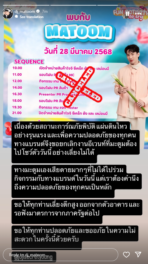 อีกหนึ่งคนดังที่ต้องยกเลิกงานเช่นกันก้คือ “ดีเจมะตูม” เจ้าตัวได้โพสต์สตอรี่แจ้งข่าวเรื่องงานว่า “เนื่องด้วยสถานะการ์ณภัยพิบัติแผ่นดินไหว อย่างรุนแรง และเพื่อความปลอดภัยของทุกคน ทางแบรนด์จึงขอยกเลิกงานอีเวนท์ที่มะตูมต้อง ไปโชว์ตัววันนี้อย่างเลี่ยงไม่ได้