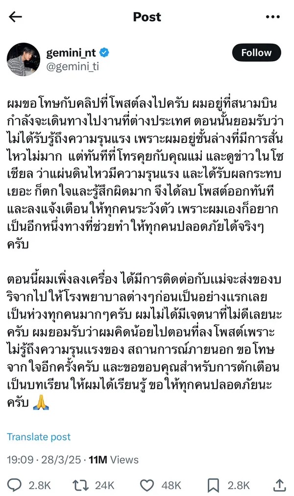 ล่าสุดทางด้าน “เจมีไนน์” ได้ออกมาร่ายยาวขอโทษกับคลิปดังกล่าวว่า “ผมขอโทษกับคลิปที่โพสต์ลงไปครับ ผมอยู่ที่สนามบิน กำลังจะเดินทางไปงานที่ต่างประเทศ ตอนนั้นยอมรับว่าไม่ได้รับรู้ถึงความรุนแรง เพราะผมอยู่ชั้นล่างที่มีการสั่นไหวไม่มาก แต่ทันทีที่โทรคุยกับคุณแม่ และดูข่าวในโซเชียล ว่าแผ่นดินไหวมีความรุนแรง และได้รับผลกระทบเยอะ ก็ตกใจและรู้สึกผิดมาก จึงได้ลบโพสต์ออกทันที และลงแจ้งเตือนให้ทุกคนระวังตัว เพราะผมเองก็อยากเป็นอีกหนึ่งทางที่ช่วยทำให้ทุกคนปลอดภัยได้จริงๆครับ