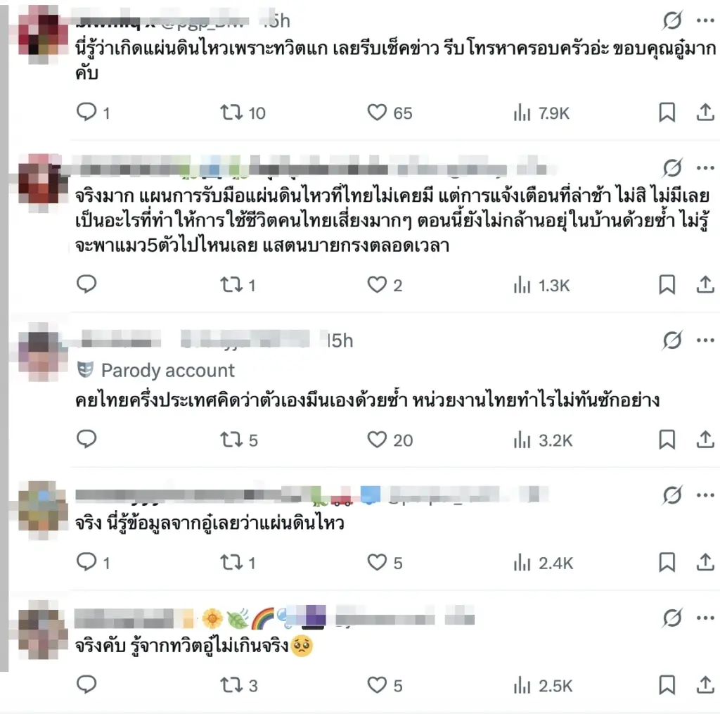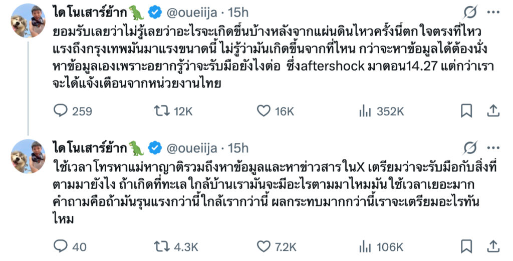 “ใช้เวลาโทรหาแม่ หาญาติ รวมถึงหาข้อมูล และหาข่าวสารใน X เตรียมว่าจะรับมือกับสิ่งที่ตามมายังไง ถ้าเกิดที่ทะเลใกล้บ้านเรา มันจะมีอะไรตามมาไหม มันใช้เวลาเยอะมาก คำถามคือถ้ามันรุนแรงกว่านี้ ใกล้เรากว่านี้ ผลกระทบมากกว่านี้ เราจะเตรียมอะไรทันไหม”