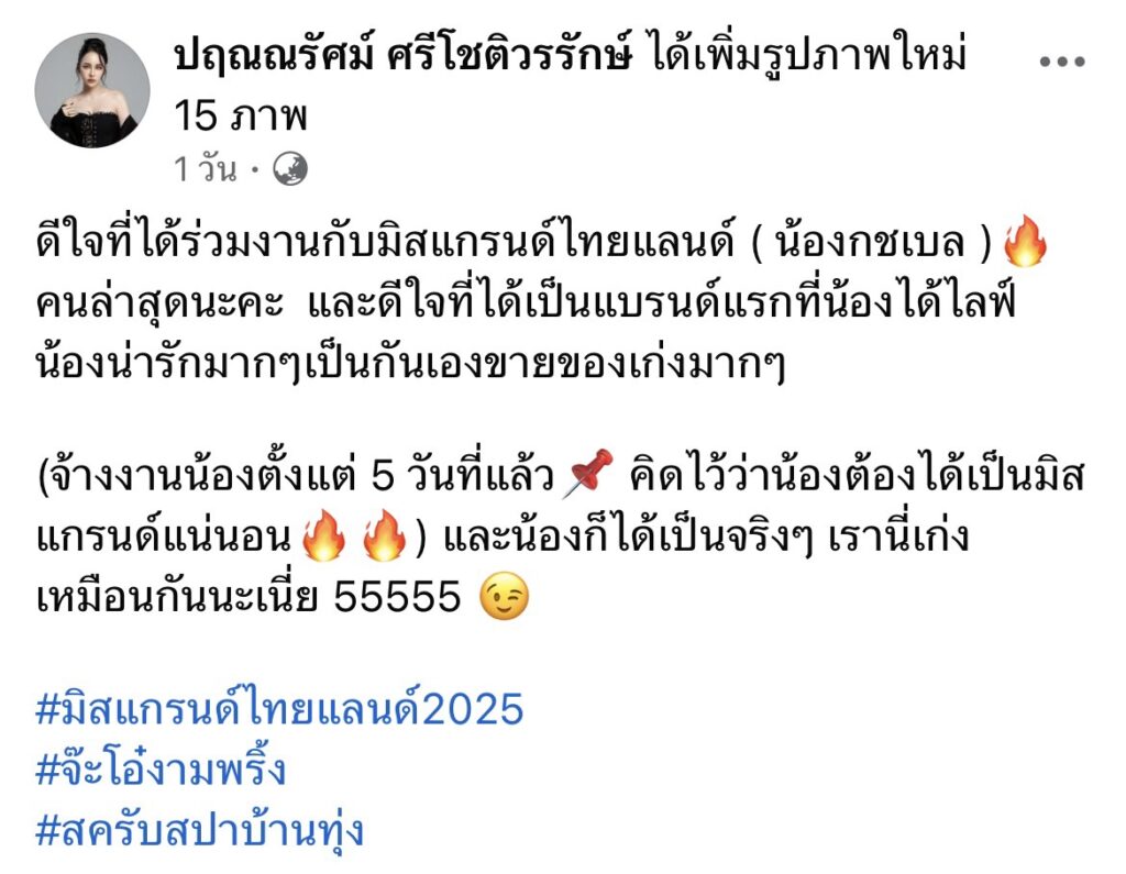 ซึ่งทางด้าน “จ๊ะโอ๋” ได้ทำการโพสต์ภาพบรรยากาศไลฟ์ขายของร่วมกับ “กชเบล” ผ่านเฟซบุ๊กส่วนตัว พร้อมระบุข้อความว่า “ดีใจที่ได้ร่วมงานกับมิสแกรนด์ไทยแลนด์ (น้องกชเบล) คนล่าสุดนะคะ และดีใจที่ได้เป็นแบรนด์แรกที่น้องได้ไลฟ์ น้องน่ารักมากๆ เป็นกันเองขายของเก่งมากๆ (จ้างงานน้องตั้งแต่ 5 วันที่แล้ว คิดไว้ว่าน้องต้องได้เป็นมิสแกรนด์แน่นอน) และน้องก็ได้เป็นจริงๆ เรานี่เก่งเหมือนกันนะเนี่ย 55555 #มิสแกรนด์ไทยแลนด์2025 #จ๊ะโอ๋งามพริ้ง”