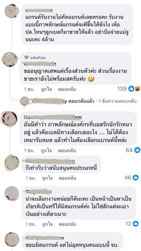 ท่ามกลางชาวเน็ตเข้ามาทัวร์ลง แห่คอมเมนท์กันรัวๆ อาทิเช่น ชอบมิสแกรนด์ แต่ไม่อุดหนุนคนแบบนี้ จบ, รอบนี้คำแก้ตัวไม่ทับใจ ขอไม่เข้าข้างค่ะ, ห๊ะ!!!! เอาจริงดิงานแรกควรเปิดตัวสวยๆกว่านี้ป๊ะ, สนับสนุนคนผิดศีลธรรม ศีลข้อ3ยังทำไม่ได้, จะเอาแต่ตัง ไม่ได้นะบอส #ไม่ชื้อค่าาา, แล้ววิชาศีลธรรมที่อยากให้เอากลับมาสอนคืออะไรแสดงว่าตอบแค่ดูดีหราคะ เงินชนะศีลธรรมซะแล้ว เลือกงานให้เด็กหน่อยเถอะ, รอบนี้คำแก้ตัวไม่ทับใจ ขอไม่เข้าข้างค่ะ, ขายของเก่งก็ได้มงแล้ว, ไม่ซื้อไม่สนับสนุน แกรนด์ปีนี้ ขอไม่ดู ติดตาม อิงฟ้า แค่นั้น” และอีกมากมาย
