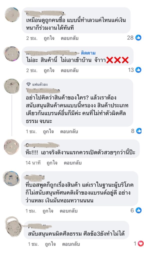 บอส : ไม่เห็นเป็นไรเลย สินค้าเขาถูกต้องตามกฎหมาย เขาจดทะเบียนมี อย. ทุกอย่างครบ เราอย่าไปคิดเยอะว่าเป็นสินค้าของใคร ความสัมพันธ์กับใคร เรื่องของเขา ถ้าเกิดคิดอย่างนี้ไม่ต้องทำมาหากินหรอก เพราะว่าคนในสังคมล้วนมีแต่เรื่องทั้งนั้น ไม่ใช่มีคนนี้คนเดียวที่มีเรื่องส่วนตัว เจ้าของแบรนด์หลายคนเขาก็มีเรื่องส่วนตัว ตราบใดที่ของถูกต้องตามกฎหมายเสียภาษี จดทะเบียนถูกต้อง ก็จบ! เราไม่ได้คบเขาเป็นเพื่อน เรารู้จักเขาในฐานะเขาซื้อศิลปิน จบ!! แยกกันนะ ระหว่างเรื่องส่วนตัวกับเรื่องงาน ทุกคนต้องแยกกันให้ออกนะ ไม่งั้นก็คงไม่ต้องทำอะไรกันเลย