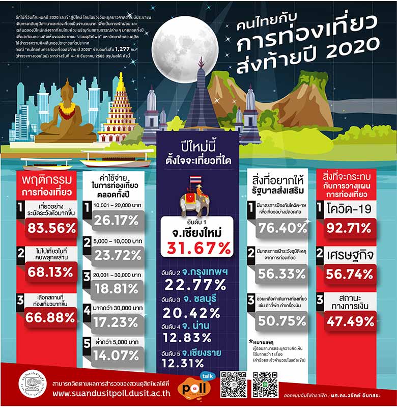 “สวนดุสิตโพล” มหาวิทยาลัยสวนดุสิต เปิดเผยผลสำรวจความคิดเห็นของประชาชนเรื่อง “คนไทยกับการท่องเที่ยวส่งท้าย ปี 2020” จากกลุ่มตัวอย่างจำนวน 1,277 คน ระหว่างวันที่ 4 – 10 ธ.ค.ที่ผ่านมา พบว่า คนไทยมีพฤติกรรมการท่องเที่ยวในปี 2020 เปลี่ยนแปลงไป โดย ร้อยละ 83.56 ไปเที่ยว อย่างระมัดระวังตัวมากขึ้น, ร้อยละ 68.13 ไม่ไปเที่ยวในที่คนพลุกพล่าน, ร้อยละ 66.88 เลือกสถานที่เที่ยวมากขึ้น ส่วนค่าใช้จ่ายในการท่องเที่ยวตลอดทั้งปี ร้อยละ 26.17 ระบุ ประมาณ 10,001 – 20,000 บาท, ร้อยละ 23.72 ระบุ 5,000-10,000 บาท และ ร้อยละ 18.81 ระบุ 2,000-3,000 บาท จังหวัดที่อย่ากไปเที่ยวมากที่สุด ร้อยละ 31.67 เชียงใหม่, ร้อยละ 22.77 กทม.,ร้อยละ 20.42 ชลบุรี อย่างไรก็ตาม สิ่งที่อยากให้รัฐบาลส่งเสริมการท่องเที่ยวในช่วงปีใหม่นี้ ร้อยละ 76.40 มีมาตรการป้องกันโควิด-19 เพื่อเที่ยวอย่างปลอดภัย, ร้อยละ 56.33 มีมาตรการเฝ้าระวังอุบัติเหตุจากการท่องเที่ยว และร้อยละ 50.75 ช่วยเหลือค่าเดินทางท่องเที่ยว นอกจากนี้ ร้อยละ 92.71 ระบุ โควิด 19 คือสิ่งที่จะกระทบต่อการท่องเที่ยวในช่วงปีใหม่ และ ร้อยละ 56.74 ระบุ สภาพเศรษฐกิจ