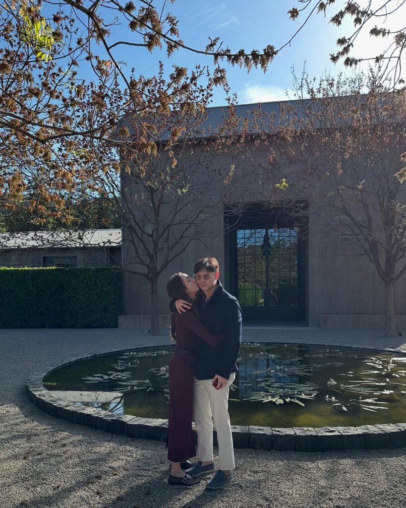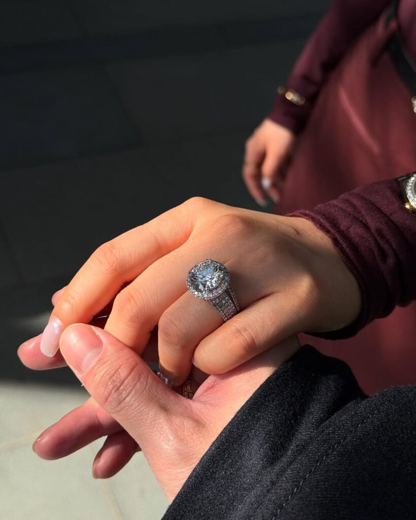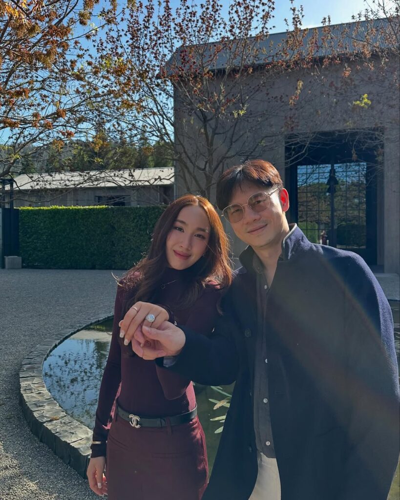 ซึ่งแปลเป็นไทยว่า “ฉันหมั้นแล้วอย่างเป็นทางการแล้วนะ✨! รักคุณมากๆ และอดใจรอไม่ไหวที่จะใช้ชีวิตที่เหลืออยู่กับคุณ ขอบคุณทุกคนที่อยู่ตรงนี้กับเรา รักนะ ฮี่ฮี่”