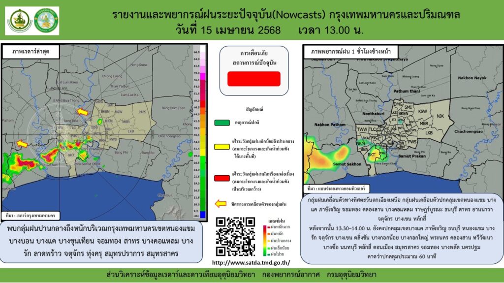 เพจ กรมอุตุนิยมวิทยา รายงานว่า วันนี้ (15 เม.ย.) เวลา 13.00 น. พบกลุ่มฝนปานกลางถึงหนักบริเวณกรุงเทพมหานครเขตหนองแขม บางบอน บางแค บางขุนเทียน จอมทอง สาทร บางคอแหลม บางรัก ลาดพร้าว จตุจักร ทุ่งครุ สมุทรปราการ สมุทรสาคร