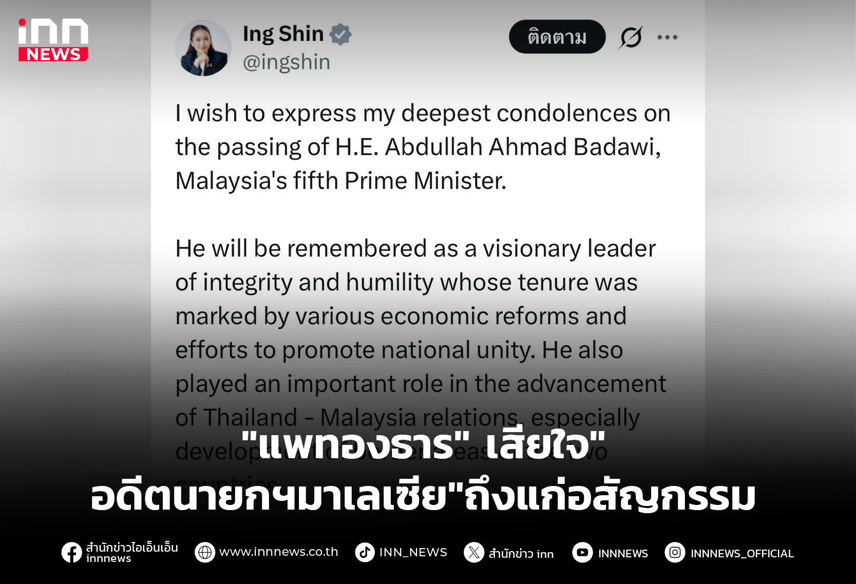 น.ส.แพทองธาร ชินวัตร นายกรัฐมนตรี โพสต์ข้อความ ขอแสดงความเสียใจอย่างสุดซึ้งต่อการถึงแก่อสัญกรรมของท่าน Abdullah Ahmad Badawi นายกรัฐมนตรี คนที่ห้าของมาเลเซีย
