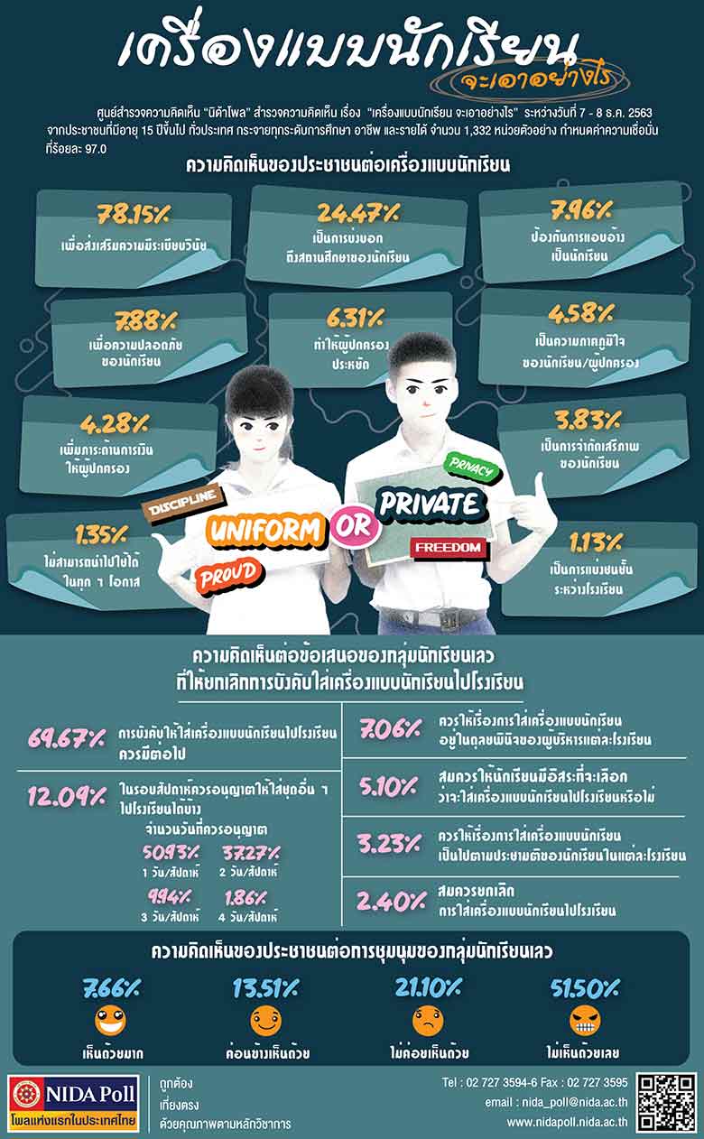 “นิด้าโพล” สถาบันบัณฑิตพัฒนบริหารศาสตร์ (นิด้า) เปิดเผยผลสำรวจของประชาชน เรื่อง “เครื่องแบบนักเรียน จะเอาอย่างไร?” ทำการสำรวจระหว่างวันที่ 7-8 ธ.ค.ที่ผ่านมา จากประชาชนที่มีอายุ 15 ปีขึ้นไป ทุกระดับการศึกษา และอาชีพ ทั่วประเทศ รวม 1,332 หน่วยตัวอย่าง เกี่ยวกับข้อเสนอของกลุ่มนักเรียนเลวที่ให้ยกเลิกการบังคับใส่เครื่องแบบนักเรียนไปโรงเรียน พบว่า ร้อยละ 69.67 ระบุ การบังคับให้ใส่เครื่องแบบนักเรียนไปโรงเรียนควรมีต่อไป และร้อยละ 12.09 ควรอนุญาตให้ใส่ชุดอื่น ๆ (ชุดชุดไปรเวท) ไปโรงเรียนได้บ้าง เช่นร้อยละ 50.93 อนุญาติให้ใส่ชุดไปรเวทได้ 1 วันต่อสัปดาห์ ทั้งนี้ ร้อยละ 78.15 ระบุว่า การใส่เครื่องแบบนักเรียน เพื่อส่งเสริมความมีระเบียบวินัย, ร้อยละ 24.47 ระบุ เป็นการบ่งบอกถึงสถานศึกษาของนักเรียน, ร้อยละ 7.96 ระบุ เป็นการป้องกันการแอบอ้างเป็นนักเรียน, ร้อยละ 7.88 ระบุเพื่อความปลอดภัยของนักเรียน และร้อยละ 6.31 ระบุ ทำให้ผู้ปกครองประหยัด อย่างไรก็ตาม เมื่อถามถึงความคิดเห็นของประชาชนต่อการชุมนุมของกลุ่มนักเรียนเลว ร้อยละ 7.66 ระบุ เห็นด้วยมาก เพราะเป็นสิทธิส่วนบุคคล ทุกคนมีสิทธิเสรีภาพในการแสดงออก, ร้อยละ 13.51 ค่อนข้างเห็นด้วย เพราะ เป็นสิทธิของนักเรียนที่จะเรียกร้องหรือแสดงความคิดเห็น, ร้อยละ 21.10 ไม่ค่อยเห็นด้วย เพราะเป็นการกระทำที่ไม่เหมาะสม หน้าที่หลักของนักเรียนคือการเรียนหนังสือไม่ใช่ออกมาชุมนุมประท้วง และร้อยละ 51.50 ไม่เห็นด้วยเลย เพราะเป็นการกระทำที่ไม่เหมาะสมอย่างยิ่ง ควรใช้เวลาทุ่มเทให้กับการเรียนจะดีกว่า