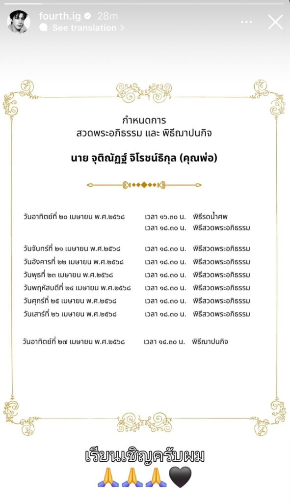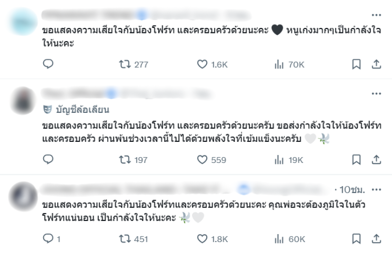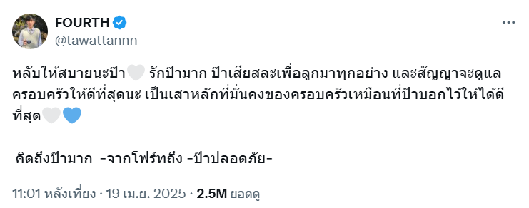 อีกทั้งยังโพสต์ข้อความผ่าน X (ทวิตเตอร์) ว่า “หลับให้สบายนะป๊า รักป๊ามาก ป๊าเสียสละเพื่อลูกมาทุกอย่าง และสัญญาจะดูแลครอบครัวให้ดีที่สุดนะ เป็นเสาหลักที่มั่นคงของครอบครัวเหมือนที่ป๊าบอกไว้ให้ได้ดีที่สุด คิดถึงป๊ามาก – จากโฟร์ทถึง -ป๊าปลอดภัย-”
