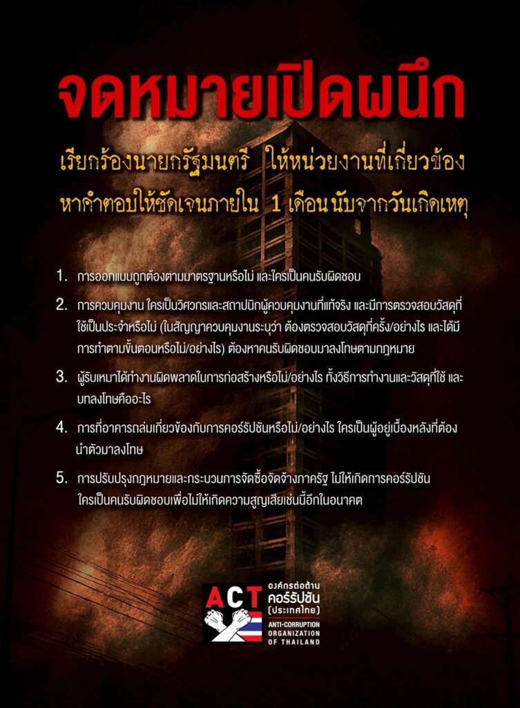 องค์กรต่อต้านคอร์รัปชัน (ประเทศไทย) หรือ ACT เผยแพร่จดหมายเปิดผนึก ลงนามโดยนายมานะ นิมิตรมงคล ประธานองค์กรฯ เรื่อง “ขอให้เร่งรัดและชี้แจงความคืบหน้ากรณีอาคารสตง.แห่งใหม่ถล่ม” ผ่านเฟซบุ๊กเพจองค์กรเมื่อ 19 เมษายน ที่ผ่านมา หลังจากนายกรัฐมนตรีออกมาชี้แจงหลังเกิดเหตุไปแล้ว 3 สัปดาห์ ทั้งช้าและไม่ชัดเจนในรายละเอียด จึงเสนอ 5 ข้อเรียกร้องที่จะรัฐบาลจะต้องแสดงให้เห็นความโปร่งใสในการตรวจสอบและการแก้ปัญหาอย่างเป็นรูปธรรม พร้อมชี้แจงต่อประชาชนและสังคมโลกภายใน 28 เม.ย.ศกนี้ หรือ 1 เดือนนับจากเกิดเหตุ