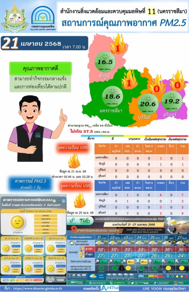 ทั้งนี้ สำนักงานสิ่งแวดล้อมและควบคุมมลพิษที่ 11 ซึ่งดูแลพื้นที่รับผิดชอบ 4 จังหวัด ได้แก่ จ.นครราชสีมา ชัยภูมิ บุรีรัมย์ และ จ.สุรินทร์ ได้รายงานการตรวจจับจุดความร้อนจากข้อมูลดาวเทียมระบบ VIIRS ในวันนี้ เมื่อเวลา 00.44 น. และ เวลา 02.28 น. ที่ จ.นครราชสีมา พบจุดความร้อน Hotspot จำนวน 1 จุด