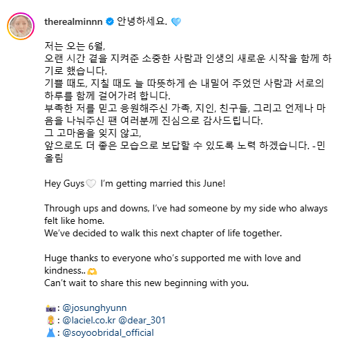 ซึ่งแปลเป็นไทยว่า “สวัสดี. 🩵 ในเดือนมิถุนายนที่จะถึงนี้ ฉันตัดสินใจที่จะเริ่มต้นชีวิตใหม่กับคนที่อยู่เคียงข้างฉันมาเป็นเวลานาน ฉันอยากเดินผ่านแต่ละวันกับคนที่คอยยื่นมือเข้ามาหาฉันอย่างอบอุ่นเสมอ ไม่ว่าฉันจะมีความสุขหรือเหนื่อยล้าก็ตาม ฉันขอขอบคุณครอบครัว คนรู้จัก เพื่อนๆ และแฟนๆ ที่เชื่อมั่นในตัวฉันและสนับสนุนฉันเสมอแม้ว่าฉันอาจมีข้อบกพร่องก็ตาม ฉันจะไม่มีวันลืมความกตัญญูนั้นและจะพยายามตอบแทนคุณในทางที่ดีขึ้นในอนาคต – โพสต์โดย Min”
