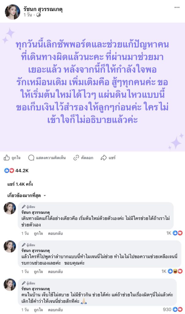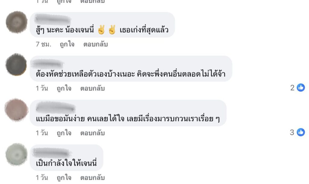 และยังคอมเมนต์เพิ่มเติมใต้โพสต์อีกว่า “เดินทางผิดแก้ได้อย่างเดียวคือ เริ่มต้นใหม่ด้วยตัวเองค่ะ ไม่มีใครช่วยได้ถ้าเราไม่ช่วยตัวเอง แล้วใครที่ไปพูดว่าลำบากแบบนี้ทำไมเจนนี่ไม่ช่วย ทำไมไม่ไปขอความช่วยเหลือ เจนนี่รบกวนช่วยเองเลยค่ะ ขอบคุณค่ะ”