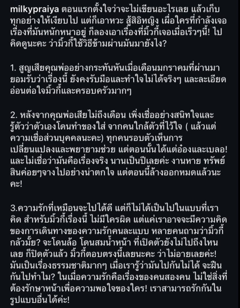 “1. สูญเสียคุณพ่ออย่างกะทันหันเมื่อเดือนมกราคมที่ผ่านมา ยอมรับว่าเรื่องนี้ ยังคงรับมือและทำใจไม่ได้จริงๆ และละเอียดอ่อนต่อใจมิ้วกี้และครอบครัวมากๆ”