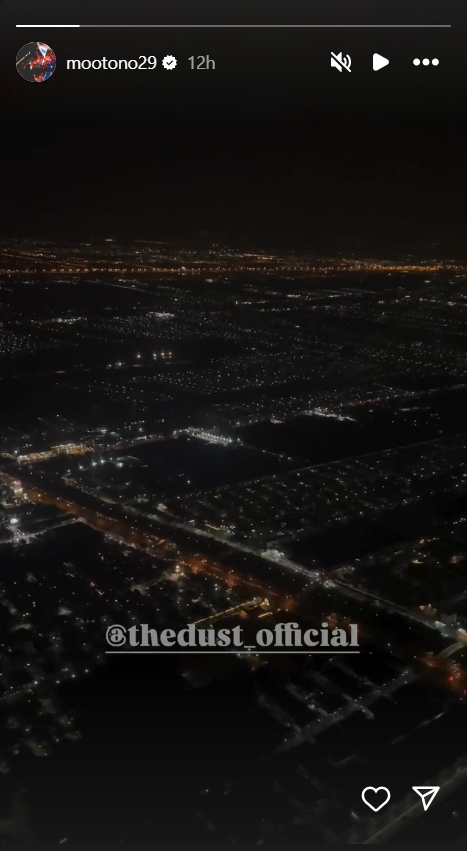 ล่าสุด “โตโน่” ได้โพสต์สตอรี่เป็นรูปมุมสูงจากเครื่องบินที่เห็นท้องฟ้ายามกลางคืน พร้อมกับติดแท็กถึง @thedust_official ท่ามกลางข่าวลือว่า “โตโน่ ณิชา” นั้นจะคืนดีกัน