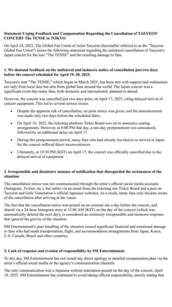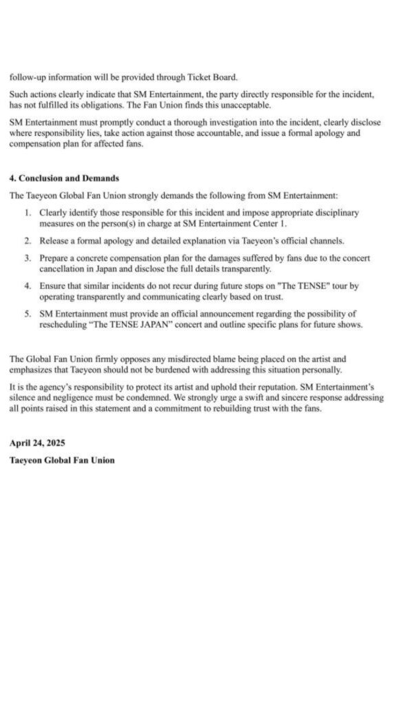 ล่าสุด “แทยอน” ได้โพสต์รูปภาพที่แฟนคลับเรียกร้องความรับผิดชอบจาก SM โดยรวบรวมคำแถลงการณ์ผ่าน The Global Fan Union ของ “แทยอน” ที่เป็นภาษาเกาหลี โดยแปลเป็นไทยมีประเด็นหลัก ๆ คือ