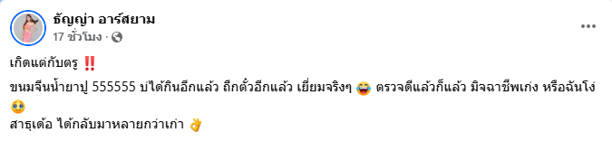 ล่าสุด “ธัญญ่า” ได้โพสต์รูปภาพที่เป็นแชทสนทนาโต้ตอบระหว่างตนกับร้านขนมจีนร้านหนึ่ง โดยระบุข้อความว่า “เกิดแต่กับตรู ขนมจีนน้ำยาปู 555555 บ่ได้กินอีกแล้ว ถืกตั๋วอีกแล้ว เยี่ยมจริงๆ ตรวจดีแล้วก็แล้ว มิจฉาชีพเก่ง หรือฉันโง่ สาธุเด้อ ได้กลับมาหลายกว่าเก่า ”