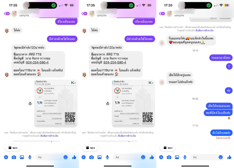 โดยในแชท “ธัญญ่า” ได้ส่งข้อความออเดอร์ขนมจีนน้ำยาปูโดยนัดแนะกับทางร้านว่าให้มาส่ง 4 โมงเย็น ซึ่งทางร้านก็รับคำมั่นอย่างดี จากนั้นเจ้าตัวจึงทำการโอนเงินไปเรียบร้อย แต่จนแล้วจนรอดใกล้ถึงเวลานัด 4 โมงเย็นแล้วขนมจีนที่สั่งยังไม่มาส่ง แชทไปถามทางร้านก็ไร้การตอบกลับใด ๆ ทำให้ได้รู้ว่าเธอโดนมิจฉาชีพเล่นงานเข้าให้แล้ว