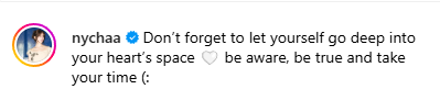 ล่าสุด “ณิชา” ได้ออกมาโพสต์รูปภาพวิวทิวทัศน์ของทะเล พร้อมระบุข้อความเกี่ยวกับความรักว่า “Don’t forget to let yourself go deep into your heart’s space 🤍 be aware, be true and take your time (:”